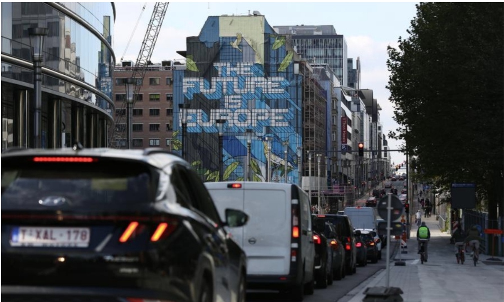 Vehicles wait for traffic light near EU headquarters in Brussels, Belgium