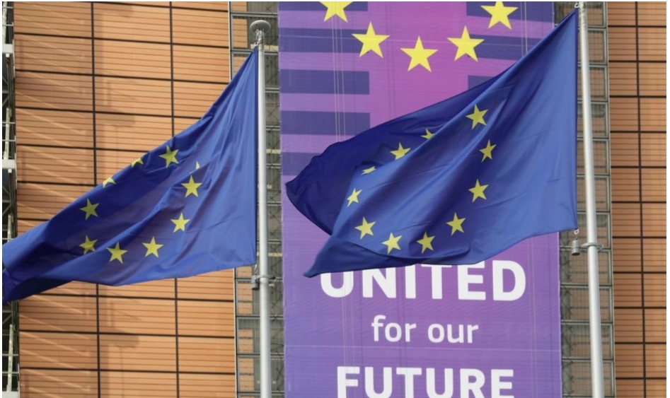 Flags of the European Union fly outside the Berlaymont Building, the European Commission headquarters, in Brussels, Belgium