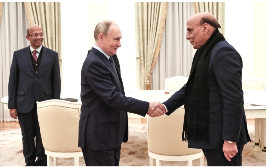 President Vladimir Putin received Raksha Mantri of India, Shri Rajnath Singh, who is in Russia on a working visit, in the Kremlin. The meeting was also attended by Russia’s Defence Minister Andrei Belousov.