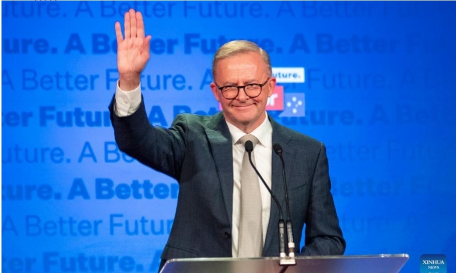 Anthony Albanese gestures as addressing supporters in Sydney, Australia, May 21, 2022.
