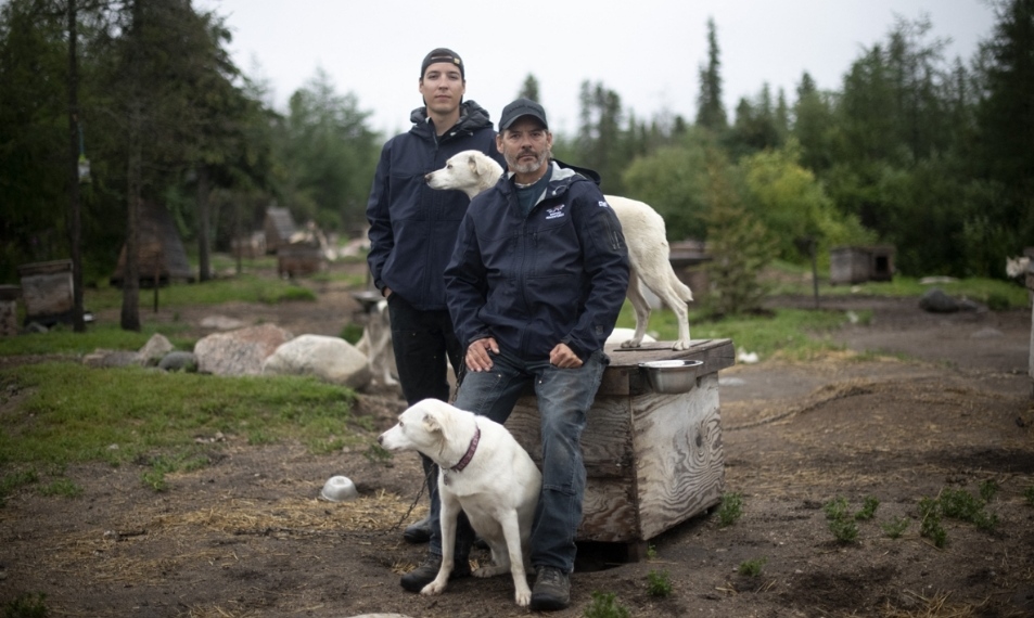 Canadian musher David Daley (front), poses with his son Wyatt Daley in Churchill, northern Canada on August 10, 2022.
