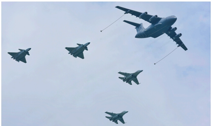 A YU-20 aerial tanker performs mock aerial refueling for a J-20 fighter jet and a J-16 fighter jet, escorted by another J-20 and another J-16