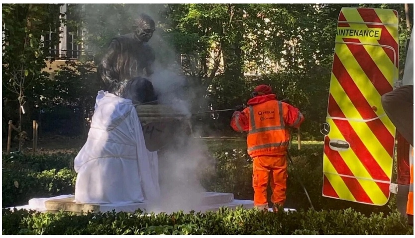 “racially aggravated”, have made no arrests. Cleaning teams sent by the local Camden Council were on site power-hosing the statue when the BBC visited on Tuesday.