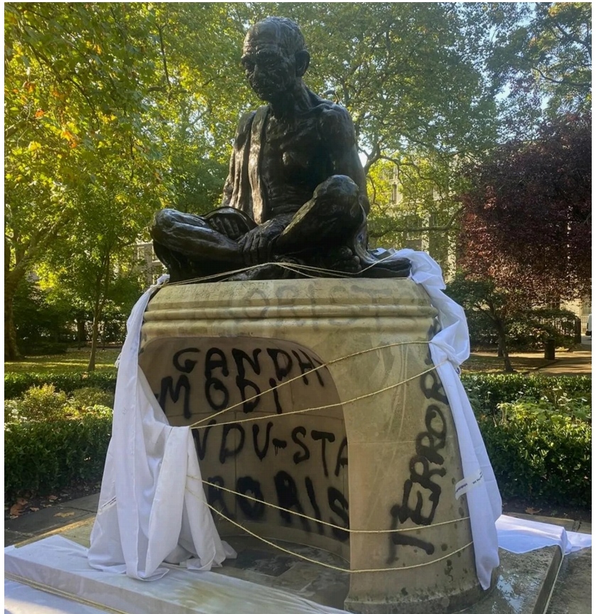 The word “Terrorists” was spray-painted in black on the statue’s plinth, along with “Gandhi, Modi and Hindustani [Indians]”.