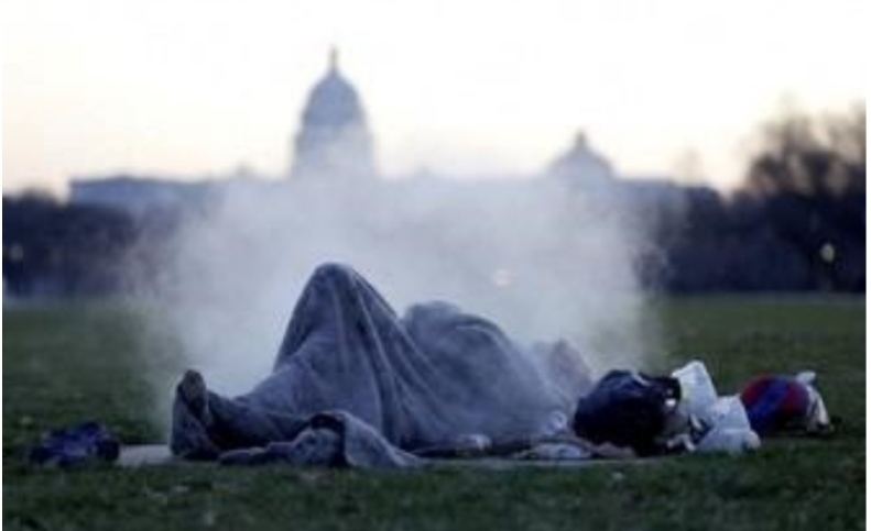 The U.S. Capitol building gives backdrop to a homeless man resting on a steam vent on the National Mall