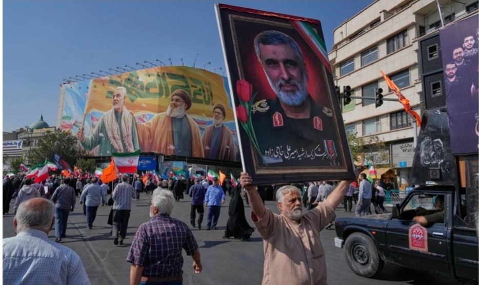 A man holds up a portrait of the late commander of Iran’s Revolutionary Guard aerospace division Gen. Amir Ali Hajizadeh, who was killed in an Israeli strike in June during an anti-Israeli rally after the Friday prayers at the Enqelab-e-Eslami (Islamic Revolution) square, in Tehran, Iran, on October 10, 2025