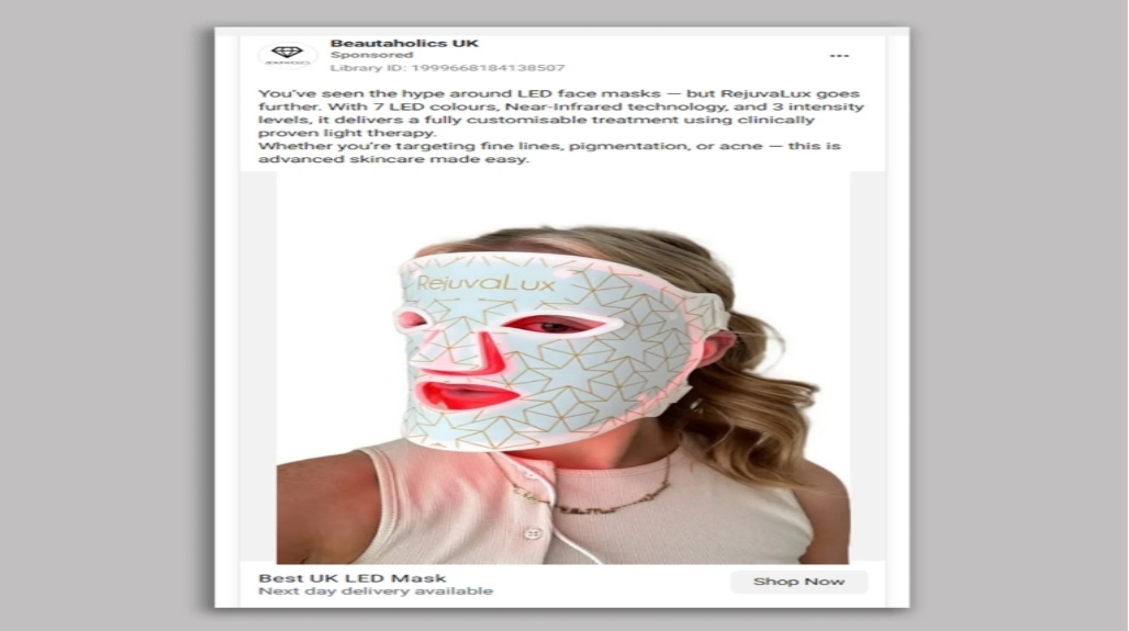 Beautaholics A social media advert showing a woman with blonde hair wearing a white LED mask with gold lines all over it and the brand Rejuvalux written across the foreheadBeautaholics