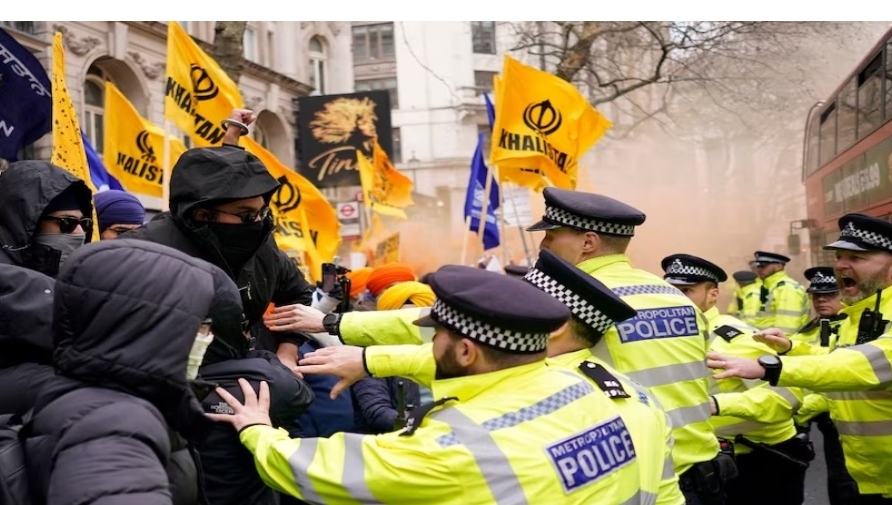 Police in high-vis jackets push a crowd of people in winter coats, with yellow KHALISTAN flag.
