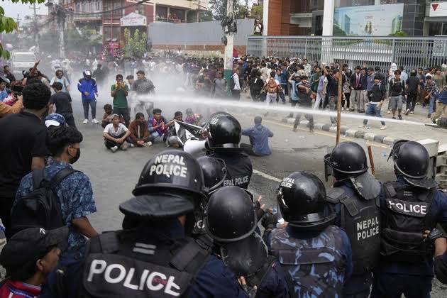 Riot police use a water cannon on protesters outside Parliament in Kathmandu, Nepal, Monday, Sept. 8, 2025. (AP Photo/Niranjan Shrestha)