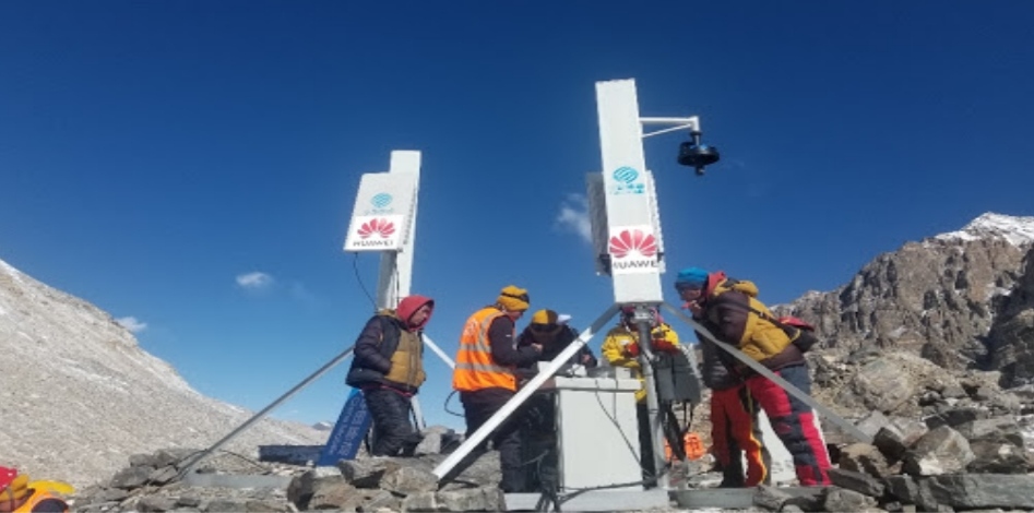 Workers putting up a 5G base station at a height of 6,500m above sea level on the north slope of Mt Everest.