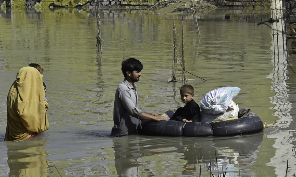 A family wades through a flood-hit area following heavy monsoon rains in Charsadda district of Khyber Pakhtunkhwa, Pakistan on August 29, 2022.