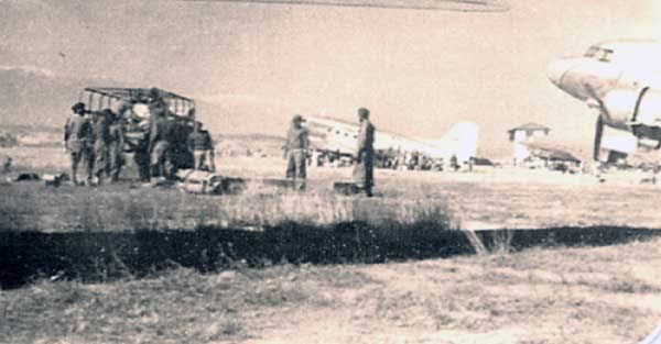 THOISE was dangerous. I was cojo to CO 43, called Bulldog Dhillon, approached from Trech- Chalunka side, rounded off, 3 pointer, touched, stick into stomach, braked, whole sand moved fwd camel ride, finally stopped. My heart was beating 3 times faster. Ground recce showed 3-5 ft deep furrows. Army Engrs swung in action to prepare ALG for T/O of Gooney Bird which was the life line in subzero temperatures.