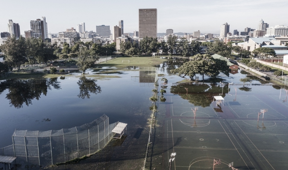 This aerial view shows sports fields under water days after heavy rains in Durban, South Africa on April 15, 2022.