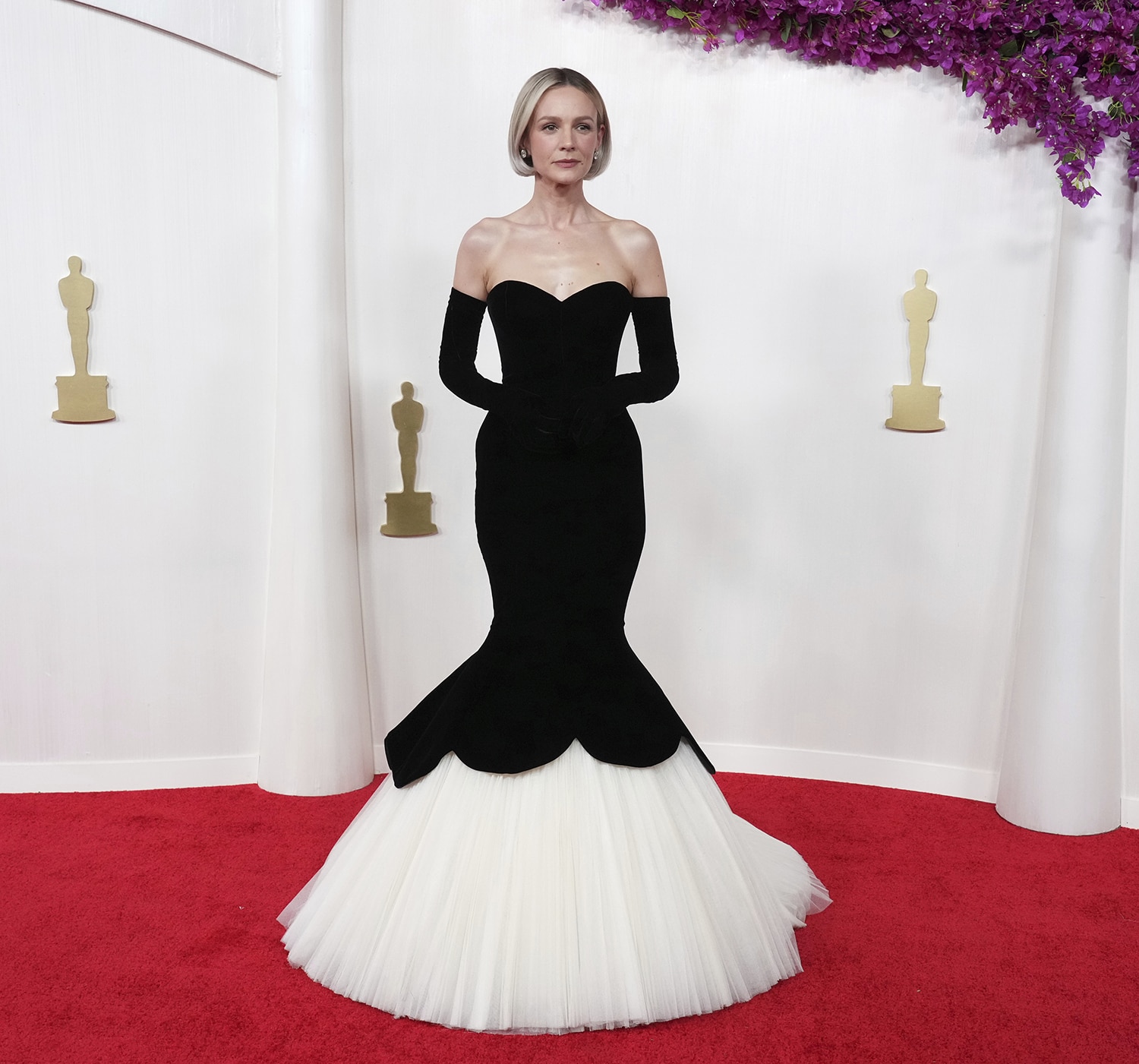The gown, cinched at the waist, featured a cream tulle mermaid trail, a recreation of an archival Balenciaga design from 1951, specially recreated by the French fashion house for the 96th Academy Awards. Mulligan complemented the gown with black opera gloves and Boucheron jewels.