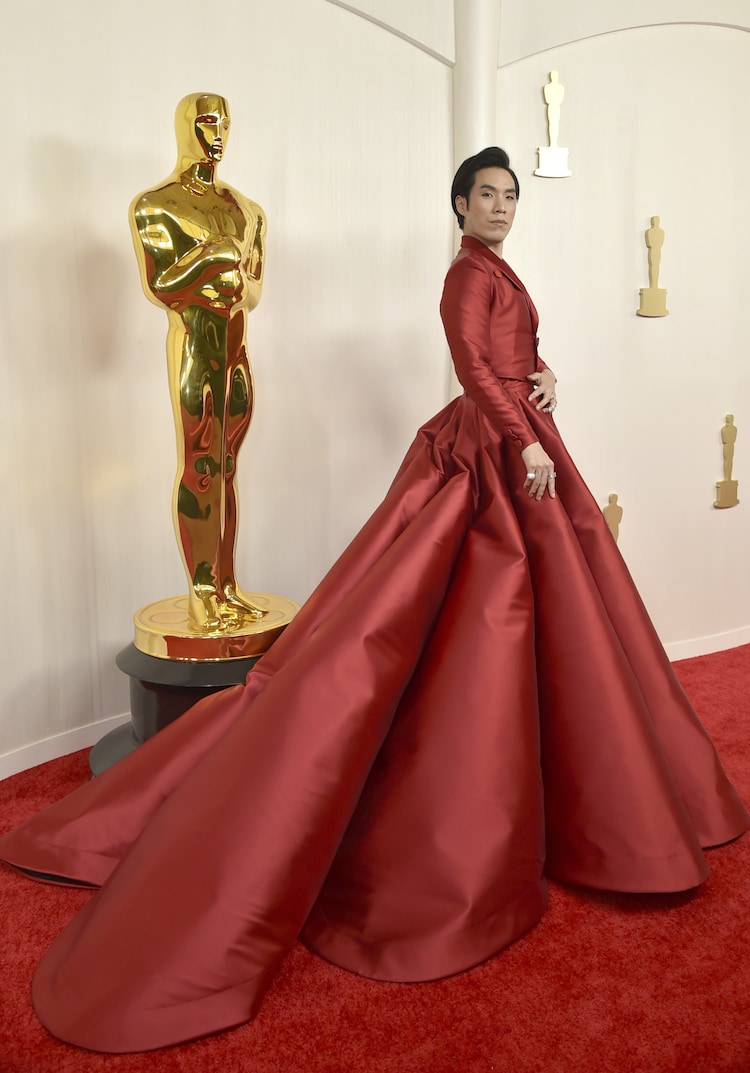 Eugene Lee Yang made a bold statement on the red carpet, channelling his unique style. The filmmaker, actor, and internet celebrity wore a striking red tuxedo suit, tailored to perfection and accentuating his physique, with a long skirt by Walter Mendez, standing out in a sea of men dressed in neutral tuxedos.