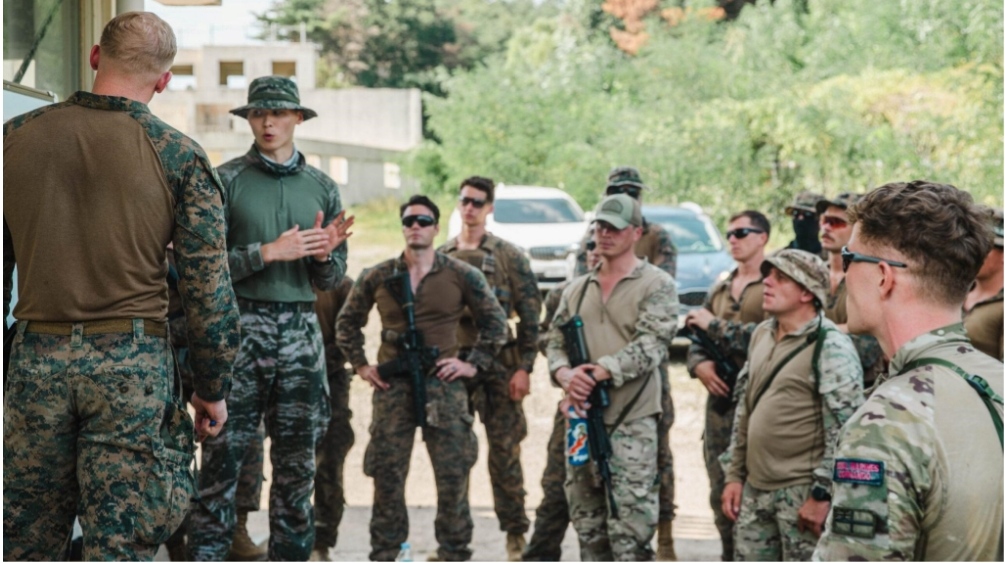 U.S. Marines assigned to Reconnaissance Company, 15th Marine Expeditionary Unit, alongside Republic of Korea special reconnaissance Marines assigned to 1st Reconnaissance Battalion, 1st ROK Marine Division, and British Royal Marine Commandos assigned to 40 Commando, discuss tactical plans before a combined raid rehearsal at Jeongcheon-ri, South Korea